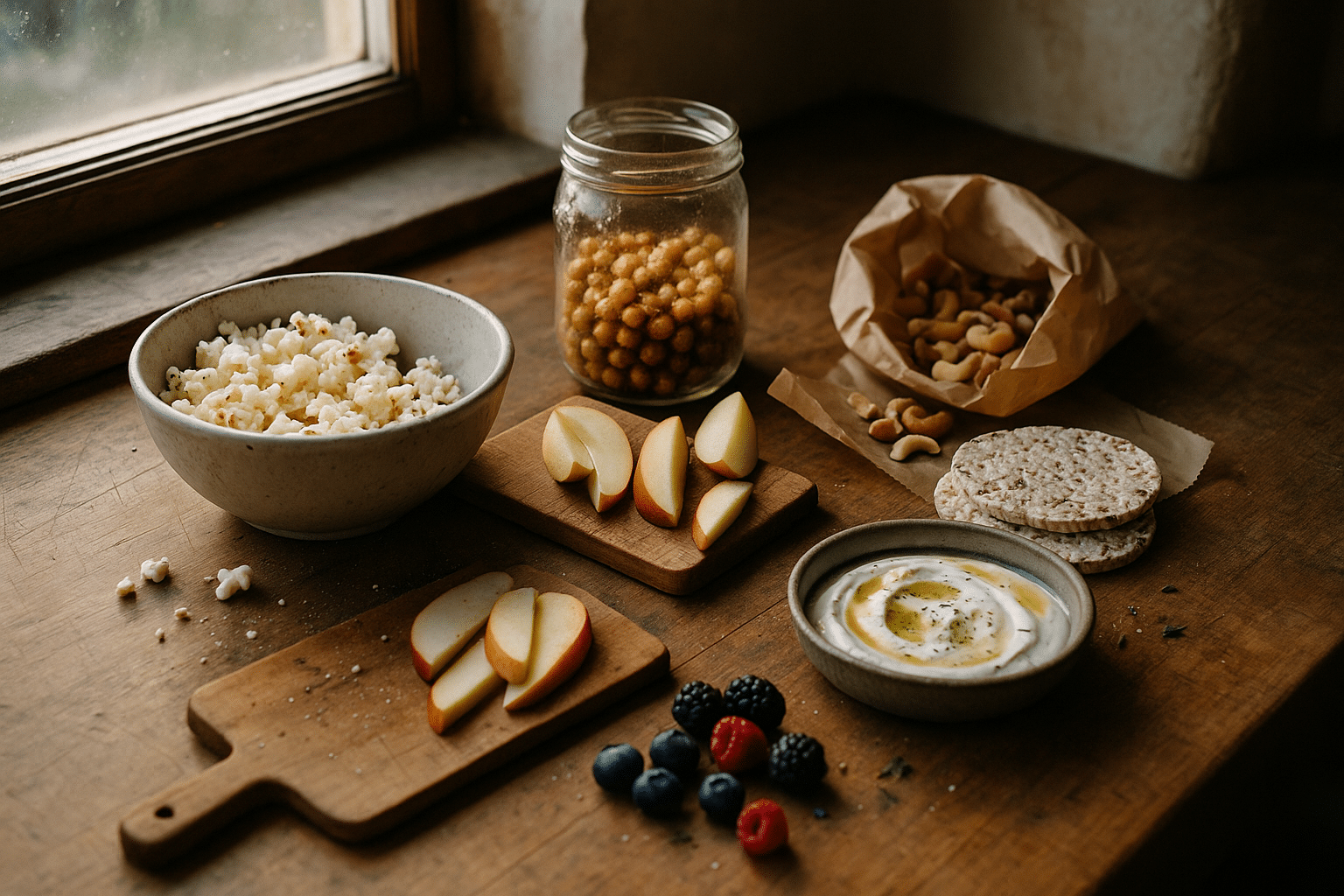 Two helpful metrics: fiber and protein. Aim for at least 3–5 g fiber across the day’s snacks and 10–20 g protein when you need steadier focus. A cup of berries brings 3–4 g fiber, while 3 cups of air-popped popcorn offers around 90–100 kcal with about 3–4 g fiber and a huge, satisfying volume. If you prefer something warm, a small bowl of oatmeal with cinnamon and chopped walnuts supplies beta-glucan fiber and crunchy satisfaction. These are not rigid rules; they’re simple rails that keep each pause for food feeling purposeful, tasty, and calm.